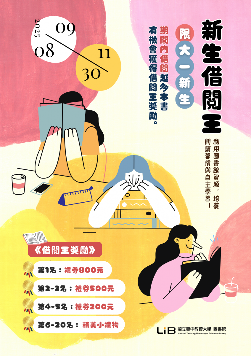 9/8~11/30本館辦理新生借閱王活動,歡迎大一新生踴躍參加