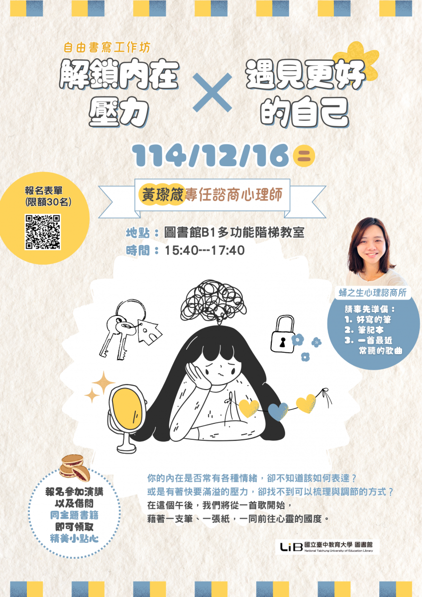 1.講題:解鎖內在壓力,遇見更好的自己-自由書寫工作坊/黃瓈箴 / 蛹之生心理諮商所 專任諮商心理師。線上報名(限額30名)