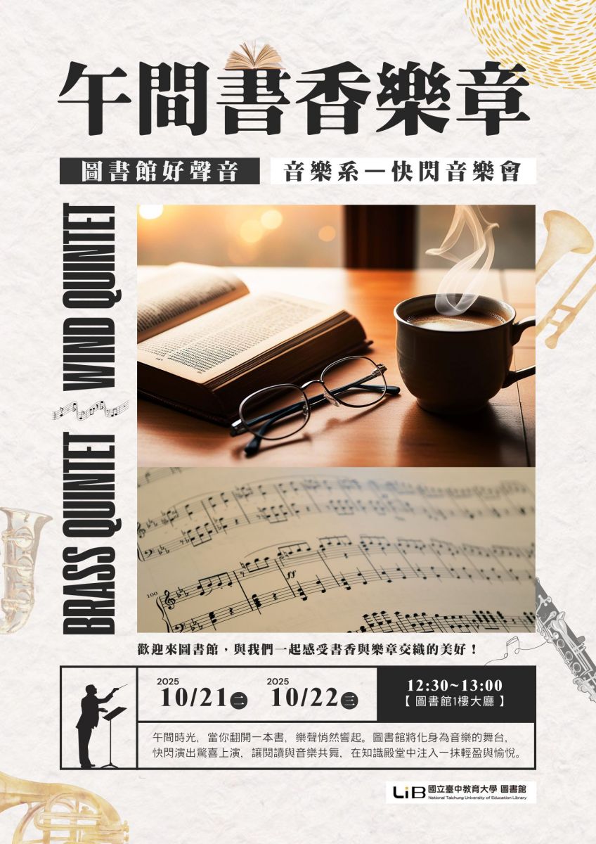 10/21(二)、10/22(三)中午12:30~13:00舉辦快閃音樂會,邀請音樂系學生於圖書館1樓大廳演奏木管及銅管五重奏,邀請一起進入音樂與書香的饗宴。