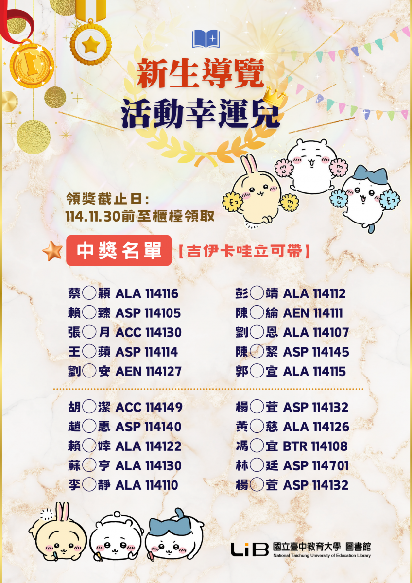 感謝參與「114年新生導覽」活動,恭喜得獎者請於11月30日前領取。