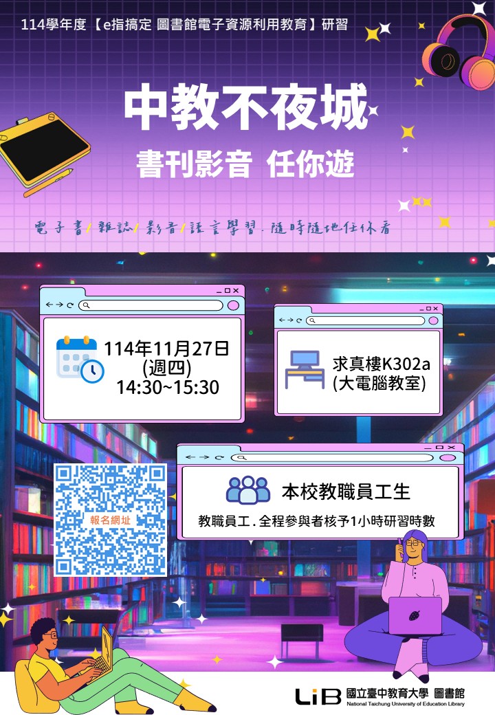 【電子資源利用教育】11月27日(週四)14:30~15:30 中教不夜城 書刊影音任你遊
