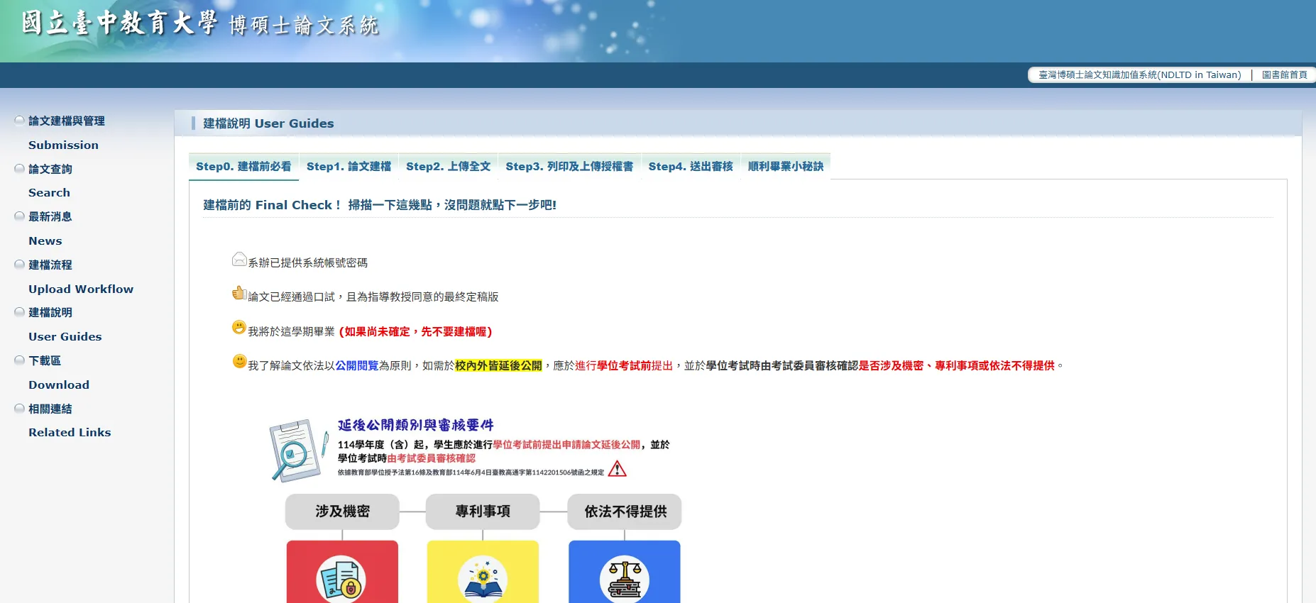 - 依據教育部學位授予法第16條及教育部114年6月4日臺教高通字第1142201506號函之規定,114學年度(含)起,學生應於進行學位考試前提出申請論文延後公開,並於學位考試時由考試委員審核確認是否涉及機密、專利事項或依法不得提供。