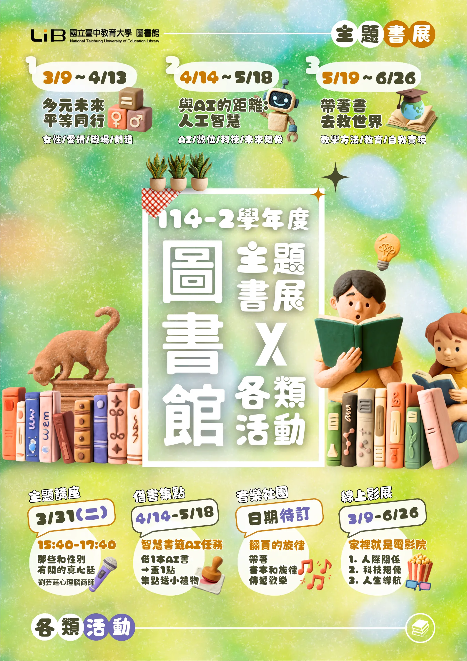 【114-2 圖書館主題書展及各類活動】--主題書展--第1場__/ 多元未來 平等同行 /展期|3/9~4/13關鍵|女性、愛情、職場、創造第2場__/ 與AI的距離:人工智慧 /展期|4/14~5/18關鍵|AI、數位、科技、未來想像第3場__/ 帶著書 去教世界 /展期|5/19~6/26關鍵|教學方法、教育、自我實現